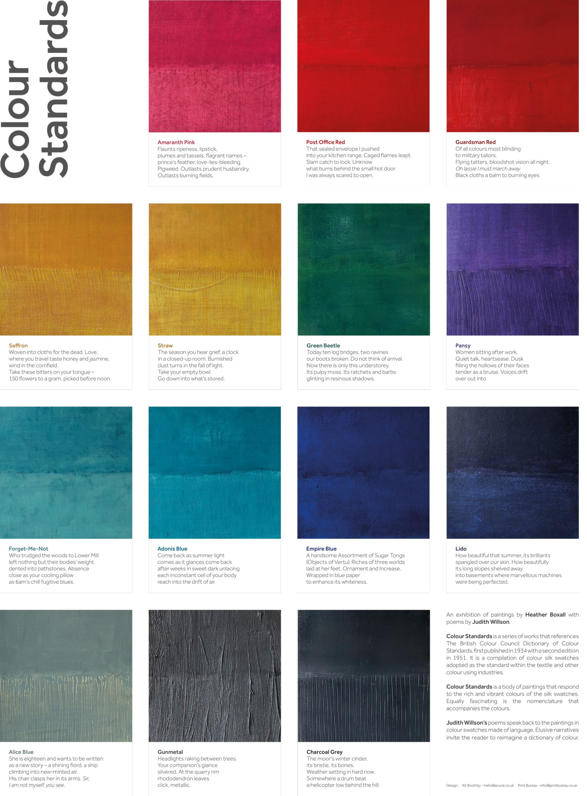 A high-quality giclée print reproducing Heather Boxall’s Colour Standards series, inspired by the British Colour Council Dictionary of Colour Standards. Accompanied by poetry from Judith Willson, this print brings together visual and literary reflections on colour.